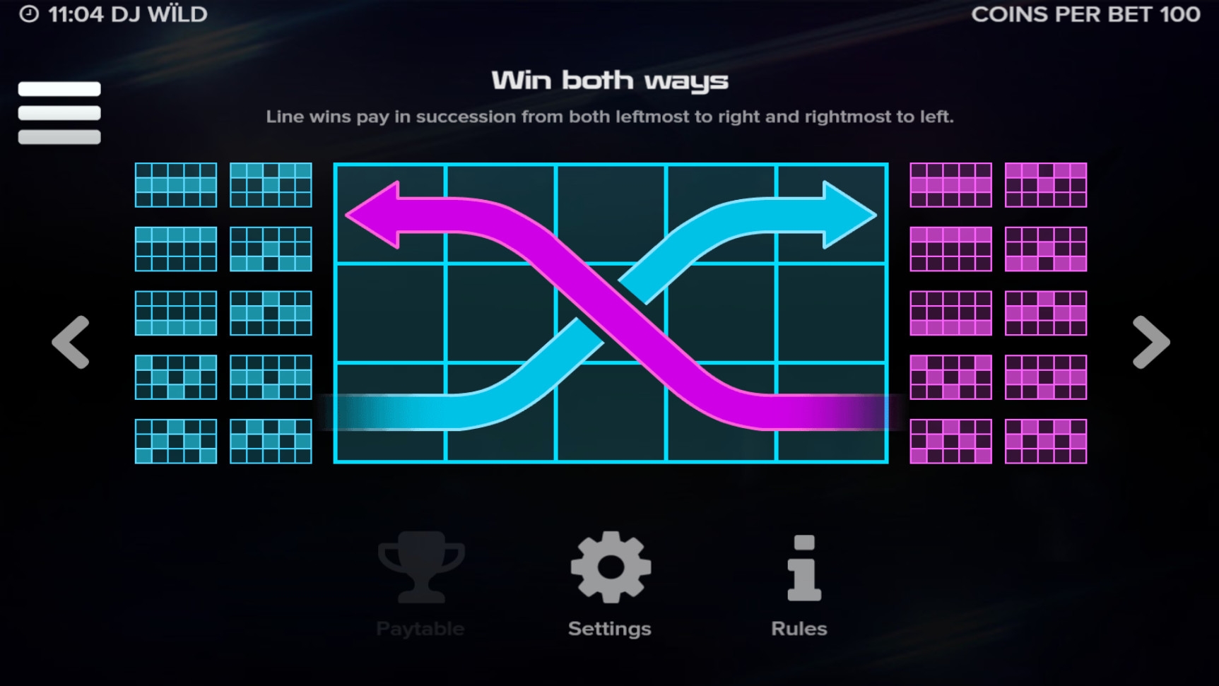 DJ Wild имеет пять барабанов и десять линий, на которых выигрышные комбинации формируются с двух сторон экрана. Количество линий всегда остается неизменным. Но ставка, по какой-то причине, всегда кратна двадцати пяти. Соответственно, на спин принимается от двадцати пяти центов до ста долларов.