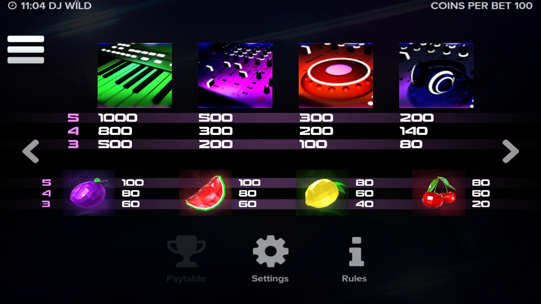 Настройки игры позволяют включить быстрый спин, отрегулировать звук и внести некоторые другие изменения. Модель открывается непосредственно в браузере, поэтому скачивать DJ Wild вы не будете.