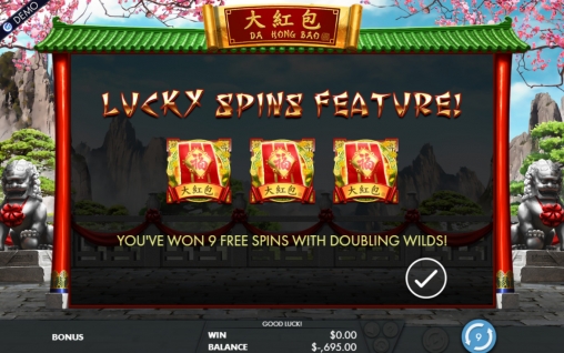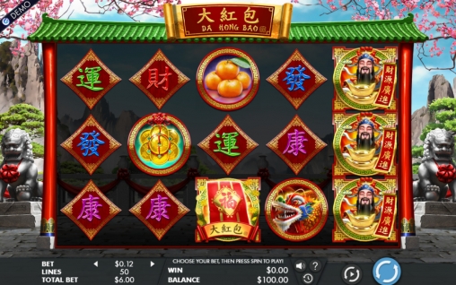 - Scatter (логотип Da Hong Bao) начинает Lucky Spins Feature, когда от трех элементов оказываются где-нибудь на экране.