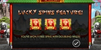 - Dragon Spins Feature – Также начинаются девять спинов на деньги казино. Джокеры в цепочках удваивают выплаты. Перед стартовым вращением символ Wild блокируется в средней позиции на пятом барабане. С каждым новым фри-спином джокер добавляется еще в одну ячейку. Все эти Wild остаются на экране до конца призовых пусков.