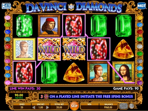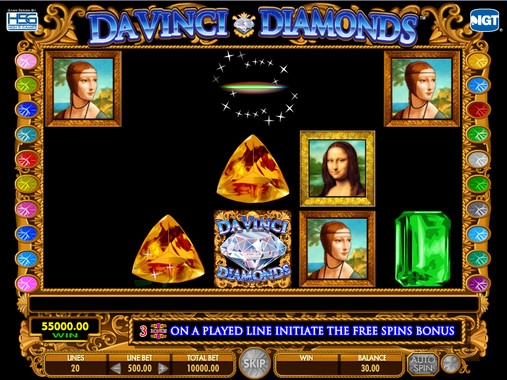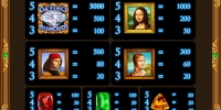 На барабанах видео-слота Da Vinci Diamonds изображены картины великого Леонардо да Винчи, а также различные драгоценные камни. В игровом автомате также есть специальные символы Wild и Bonus.