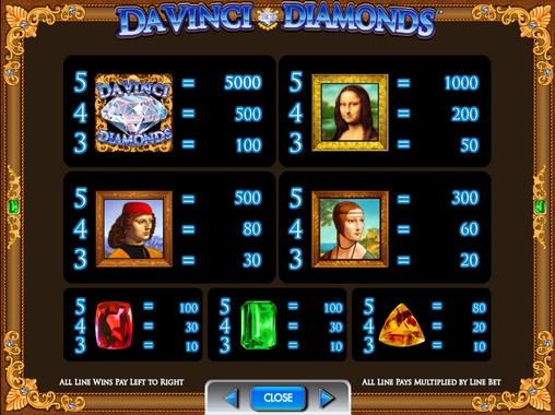 Изображения на экране видео-слота Da Vinci Diamonds размещаются в три ряда. Выигрышные комбинации образуются из нескольких одинаковых картинок, выпадающих подряд на активной линии, начиная с первого барабана. На каждой линии оплачивается только старшая комбинация. Сумма выигрыша рассчитывается умножением ставки по линии на коэффициент комбинации (до х5000).