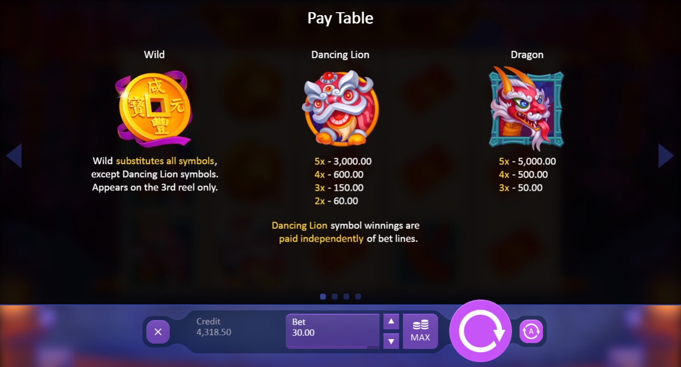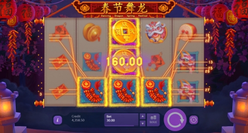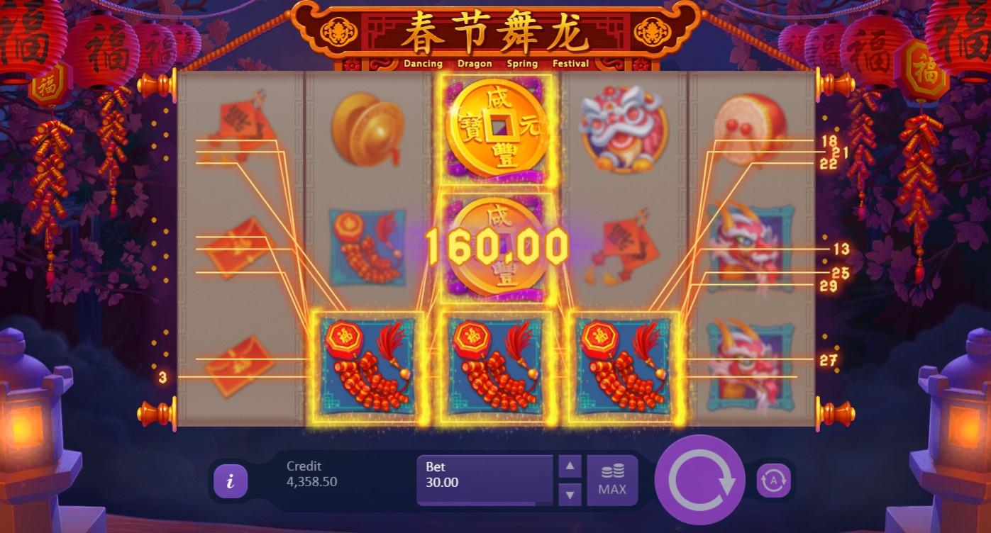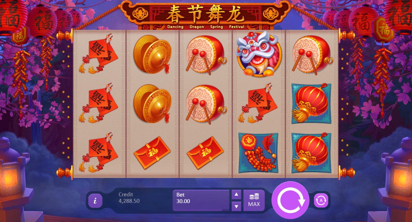 В видео-слоте Dancing Dragon Spring Festival пять барабанов с картинками, тридцать фиксированных линий и пятнадцать позиций для символов на главном экране.