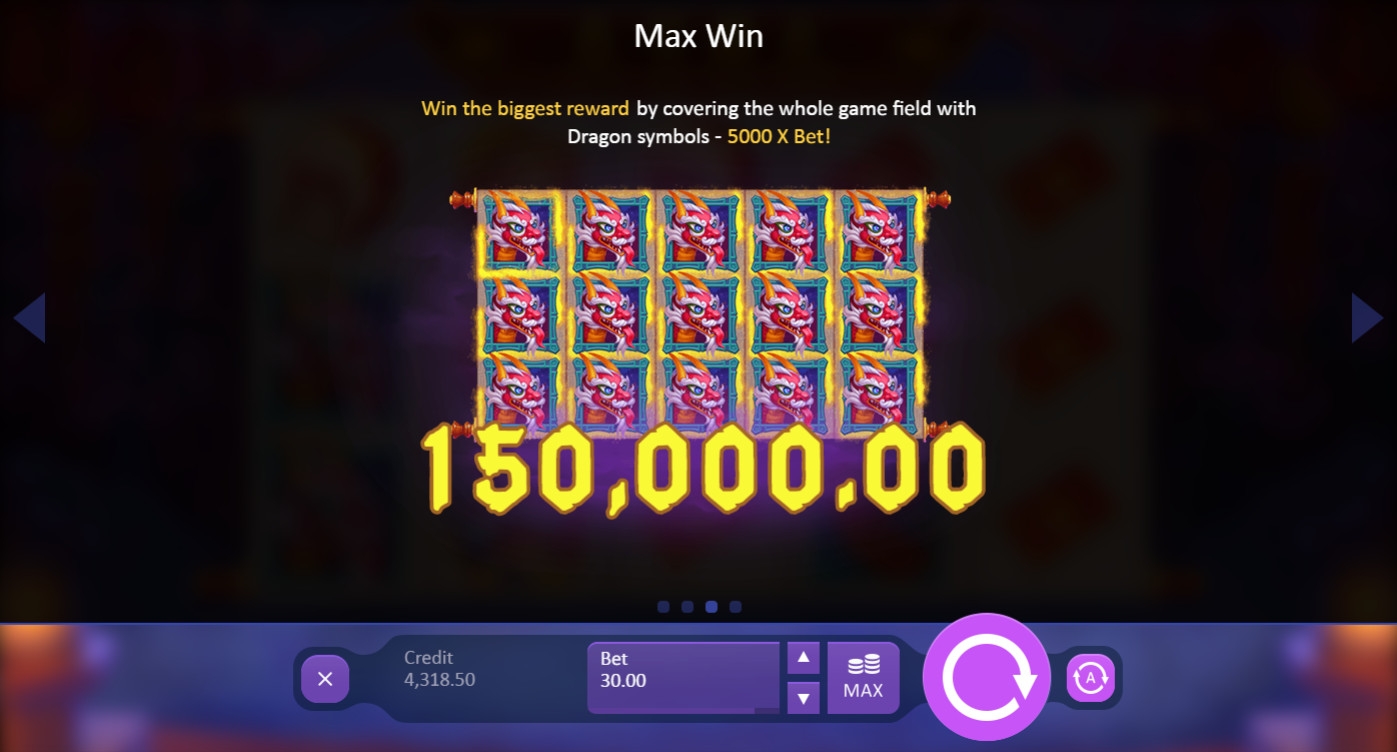 - Max Win – Если вам удастся залить все пятнадцать ячеек изображениями дракона, общая выплата будет равна пяти тысячам суммарных ставок.