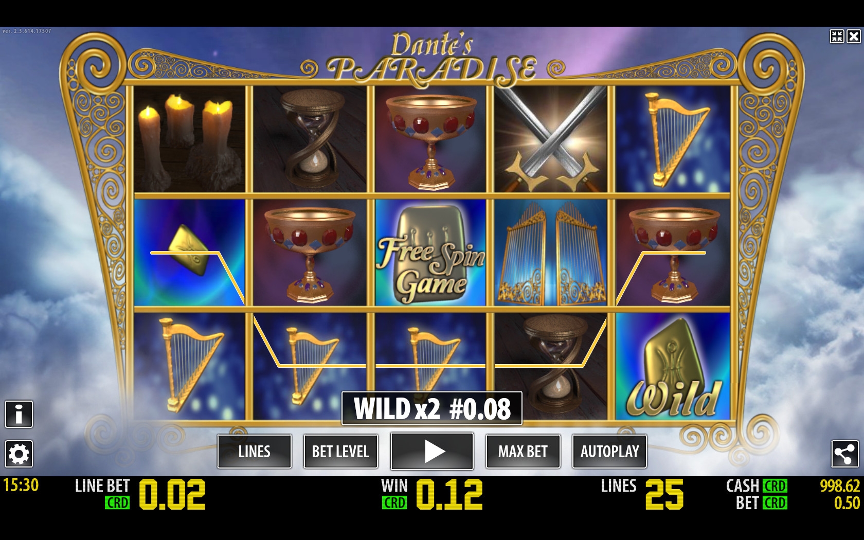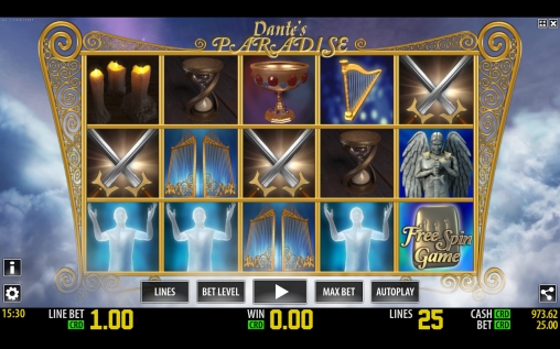 В Dante’s Paradise пять барабанов. Картинки на экране располагаются в три ряда. Соответственно, одновременно видно пятнадцать изображений, из которых образуются выигрышные комбинации. Формирование таких цепочек происходит на задействованных линиях. Вы можете активировать одну, пять, десять, пятнадцать или двадцать пять полос.