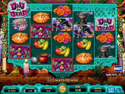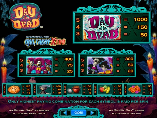 Выигрышные комбинации образуются из по принципу, который создатели видео-слота Day of the Dead назвали MultiWay Xtra (он используется также в других моделях от IGT). Выплаты начисляются за три и более одинаковых картинки, расположенных рядом на соседних барабанах начиная с первого или с пятого в обратном направлении. Всего в Day of the Dead предусмотрено 720 вариантов комбинаций.
