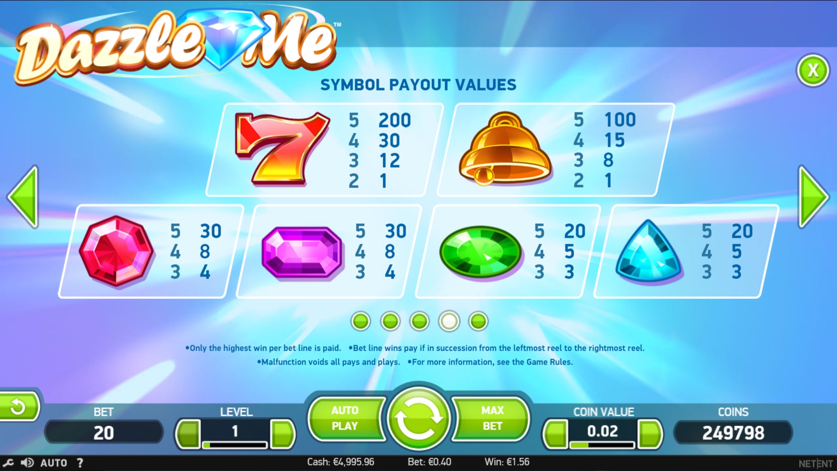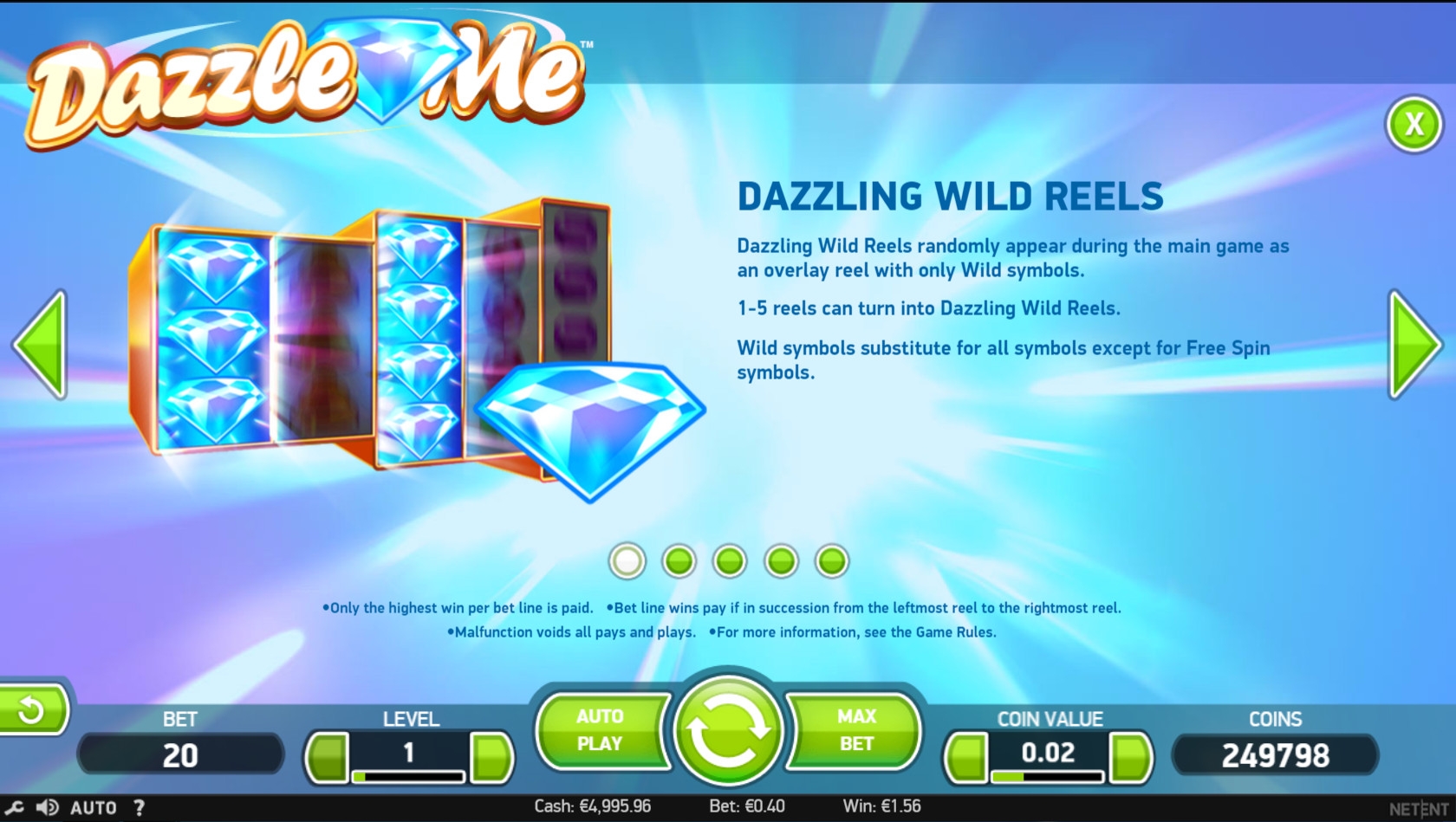 Прогрессивный джекпот в Dazzle Me не разыгрывается.