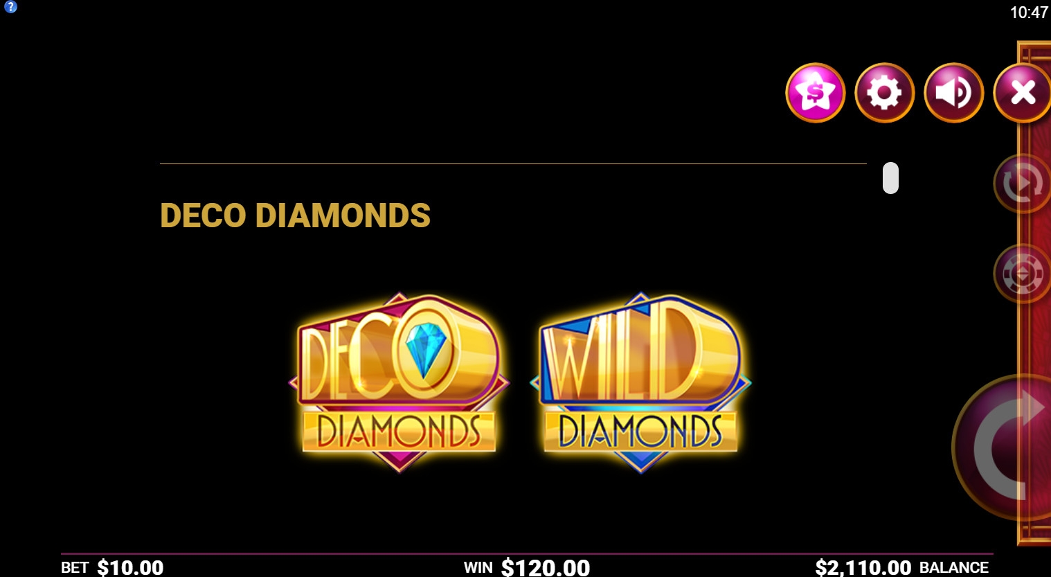Регулировать в Deco Diamonds можно звук, размер окна, скорость игрового процесса и количество спинов в автоматическом режиме. Открывается видео-слот в браузере. Пользователям смартфонов предлагается мобильная версия.