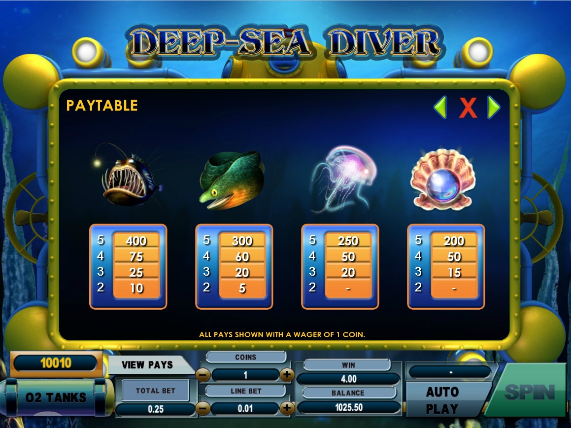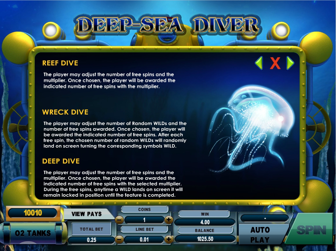 Deep Sea Diver является слот-машиной для онлайновых казино, в которой представлены пять барабанов, двадцать пять линий и три ряда символов на основном экране.
