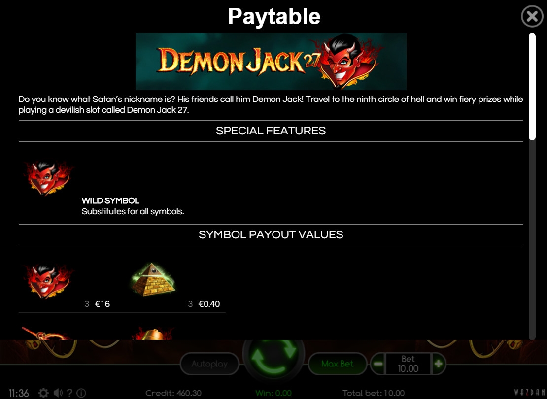 Demon Jack 27 – бесплатный игровой автомат с тремя барабанами и девятью картинками на экране. Хотя здесь всего три колонки, его вряд ли следует считать аппаратом классического типа в силу определенных особенностей дизайна и геймплея.