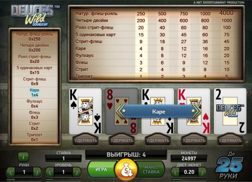 Если играть в видео-покер «“Дикие” двойки с удвоением» по базовой стратегии, можно добиться теоретического возврата 97,97% по ставке пять монет или 96,77% по одной-четырем монетам. Примите это к сведению.