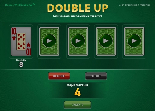 Она выдержана в привычном стиле. Вы должны будете наугад выбрать красный или черный цвет. Затем виртуальный дилер откроет карту. Если она будет этого цвета, ваш выигрыш удвоится. В одном раунде можно действовать до пяти раз подряд, но ошибаться нельзя.
