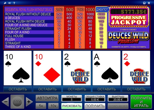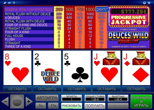 В видео-покере Deuces Wild Progressive разыгрывается накопительный джек-пот. Чтобы за него побороться, нужно играть по пяти монетам. При этом номинал монет может быть разным, но если он ниже максимального, игрок претендует не на полную сумму джек-пота.