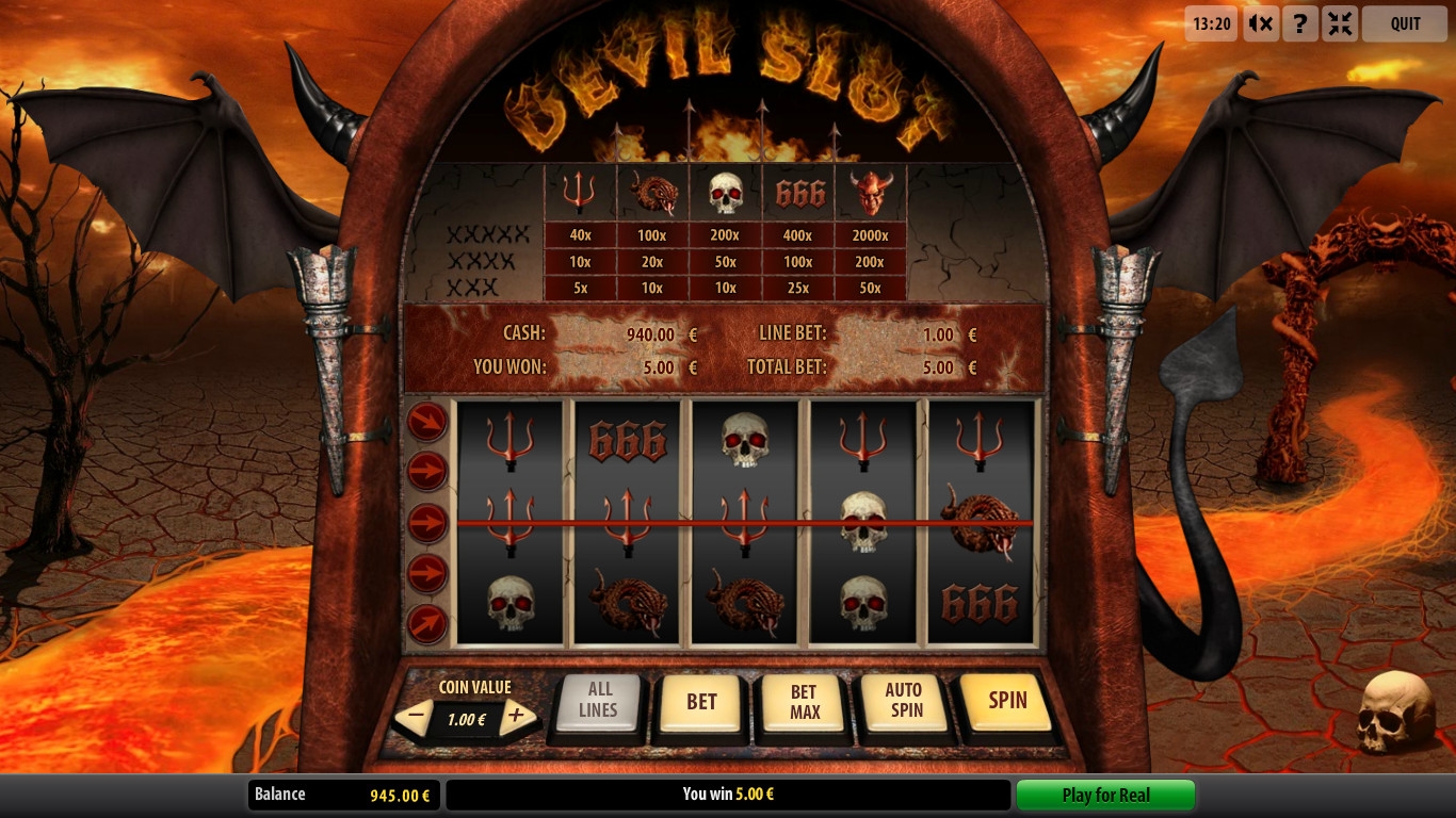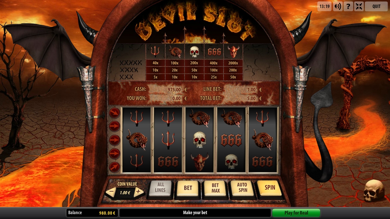 Дьявольский слот - хорошо придумали. Сразу появляется желание зайти посмотреть и проверить этот зловещий автомат. Жаль конечно что джек-пот не предусмотрен, с ним было бы на много интересней, но по поводу интерфейса - пять с плюсом)