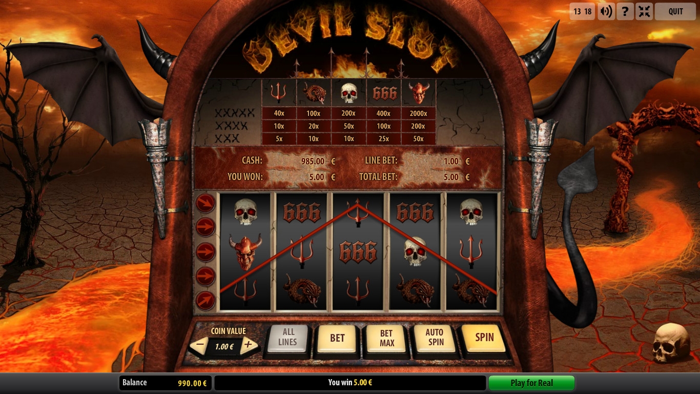Игровой автомат Дьявольский слот, 5 барабанов, 5 активных линий. Особых символов нет. Фри-спины также правилами не предусмотрены, не разыгрывается прогрессивный джекпот.