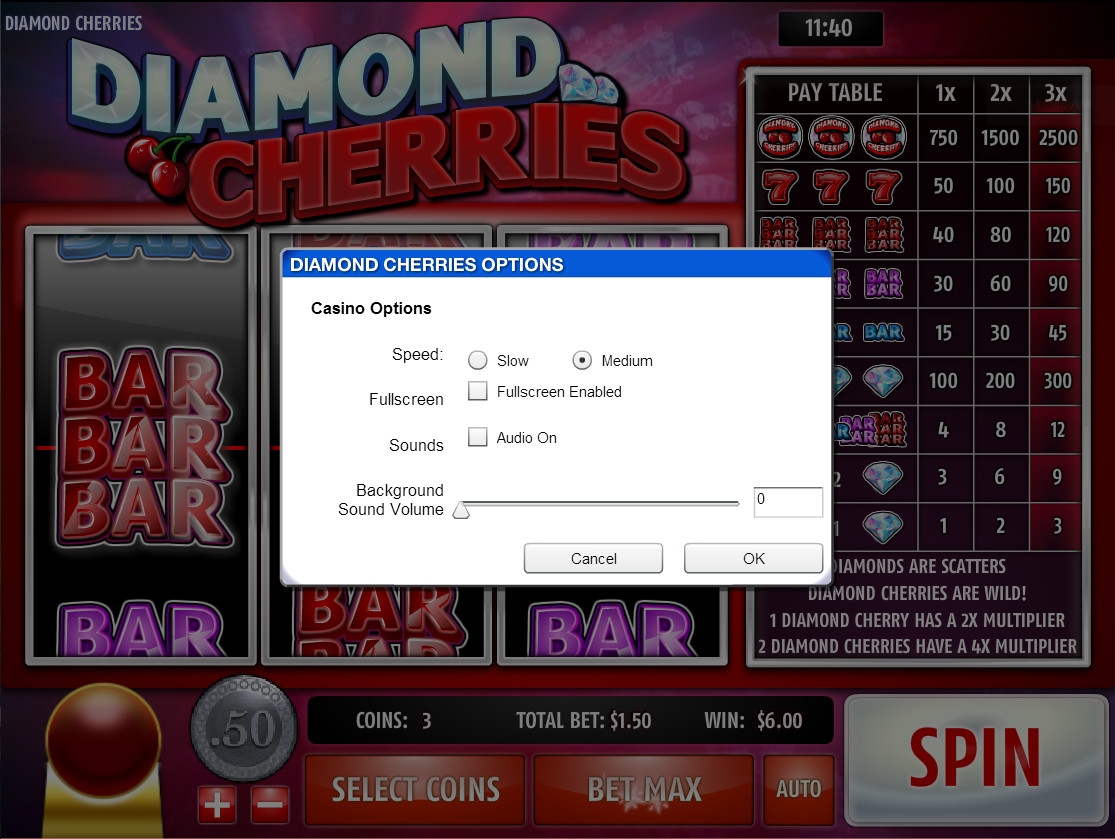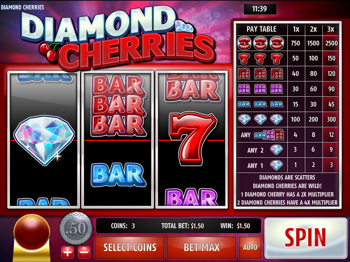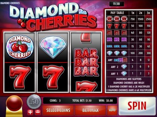 В «Бриллиантовых вишенках» три барабана и всего одна линия для образования выигрышных цепочек. Поставить на нее можно одну, две или три монеты номиналом 0.01, 0.05, 0.10, 0.25, 0.50, 1, 2, 5 или 10 кредитов.