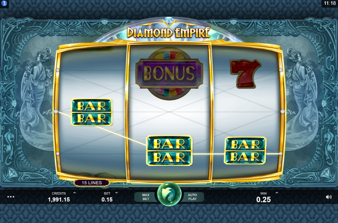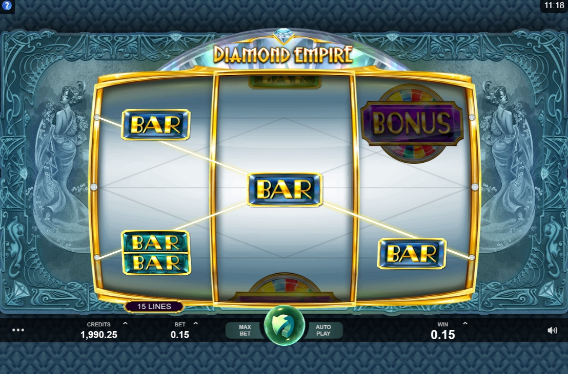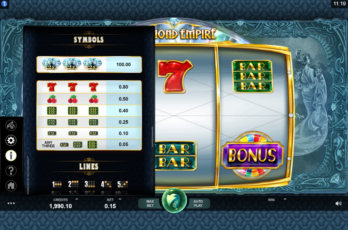 Видео-слот «Бриллиантовая империя» состоит из трех барабанов. Активных полос пятнадцать. Их количество менять нельзя.