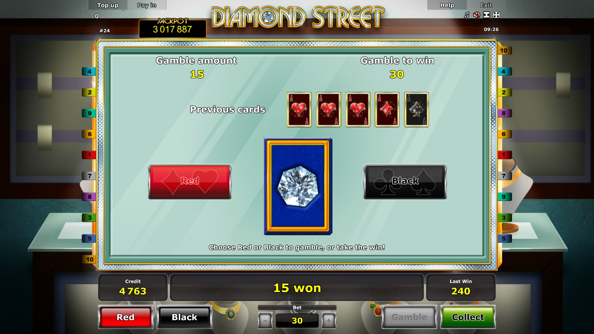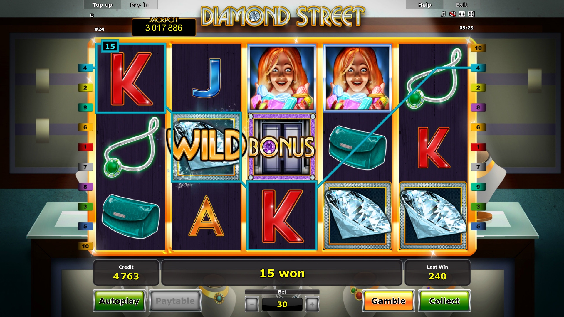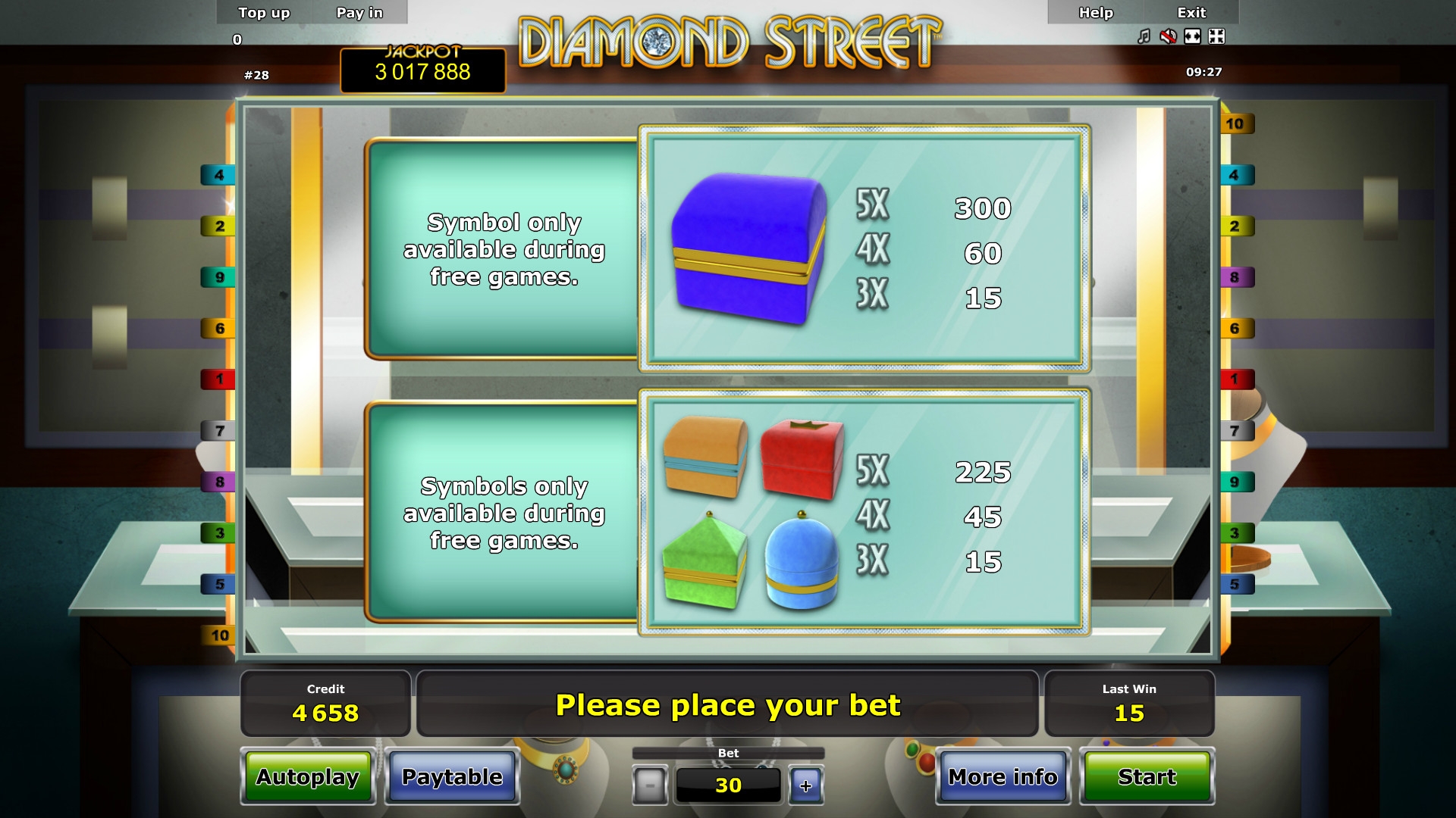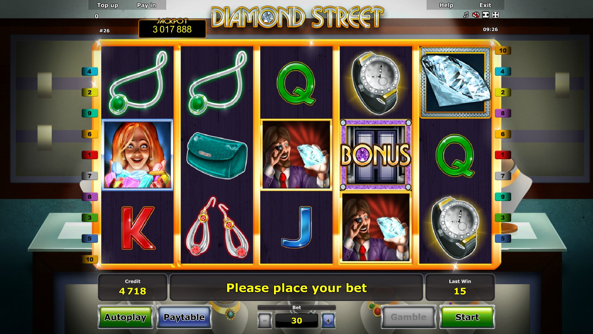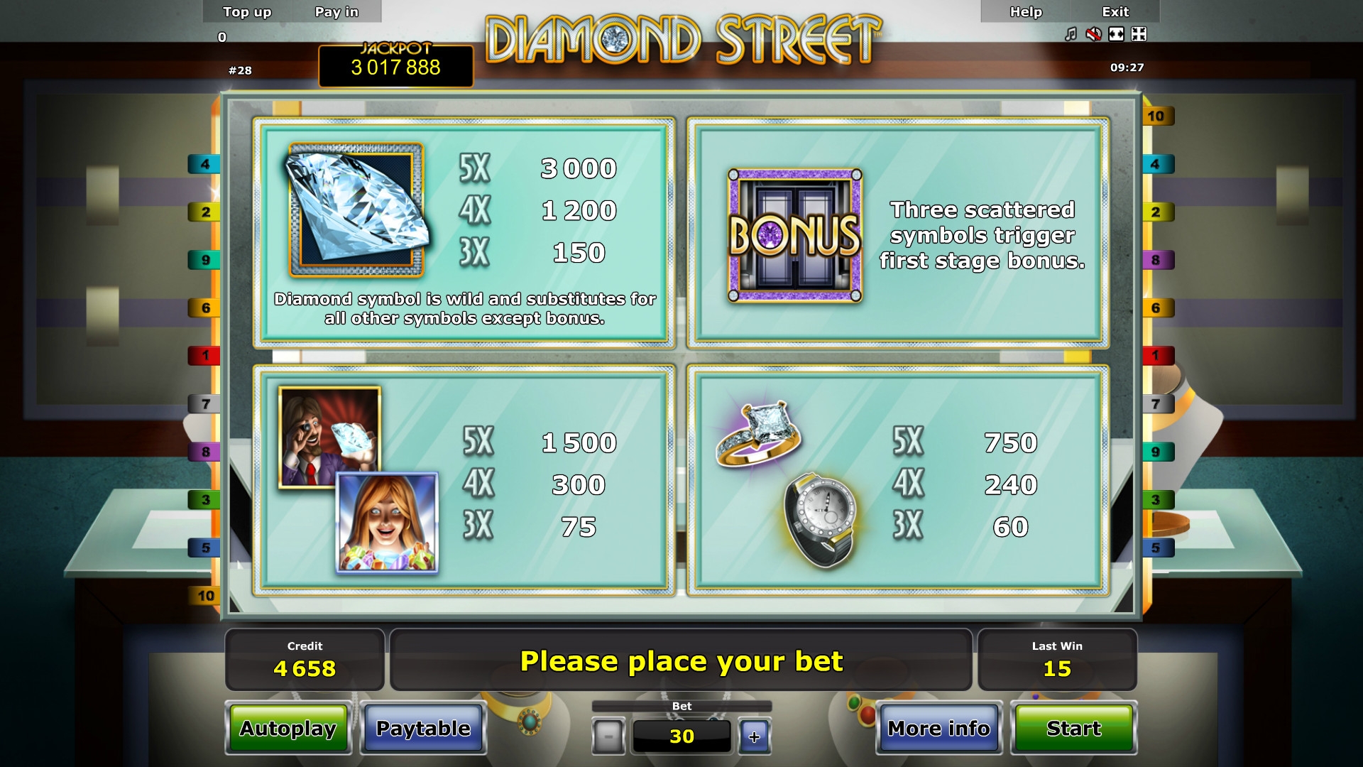 Diamond Street является пятибарабанным онлайн-аппаратом для бесплатного тестирования или реальной игры на деньги. На экране одновременно можно увидеть пятнадцать картинок.