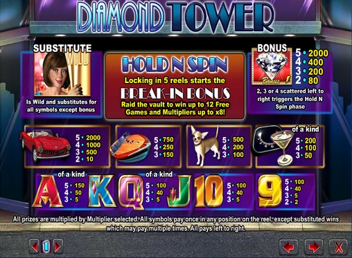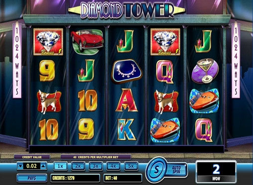 Diamond Tower – пятибарабанный игровой автомат с четырьмя рядами картинок на экране и 1024 способами получения оплачиваемых комбинаций. В этом видео-слоте отсутствуют обычные активные линии. Выигрыши начисляются за одинаковые картинки, выпадающие на соседних барабанах, начиная с первого.