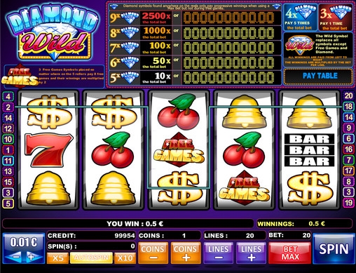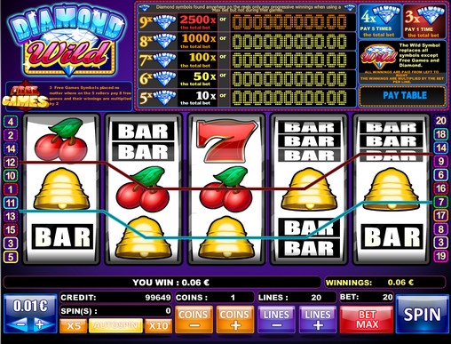 Играть на игровом автомате Diamond Wild можно по одной – двадцати линиям, поставив на каждую из них до десяти монет номиналом 0.01, 0.02, 0.05 или 0.10 евро. Следовательно, на спин принимается до двадцати евро (на примере Netbet Casino).