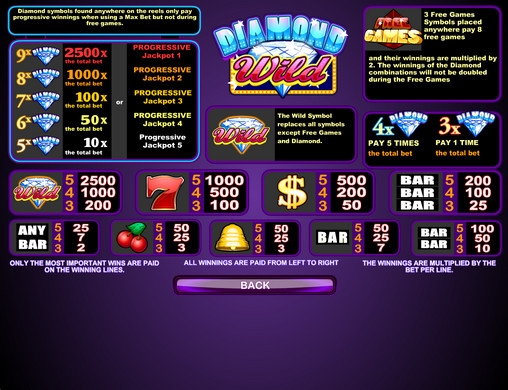 В видео-слоте Diamond Wild разыгрываются накопительные джек-поты. Получить их можно, играя по максимальной ставке. Всего джек-потов пять. Они полагаются за пять, шесть, семь, восемь или девять символов Diamond, расположенных где-нибудь на экране. Если игра ведется не по самой большой ставке, символы Diamond оплачиваются по установленным коэффициентам (соответственно х10, х50, х100, х1000 и х2500).
