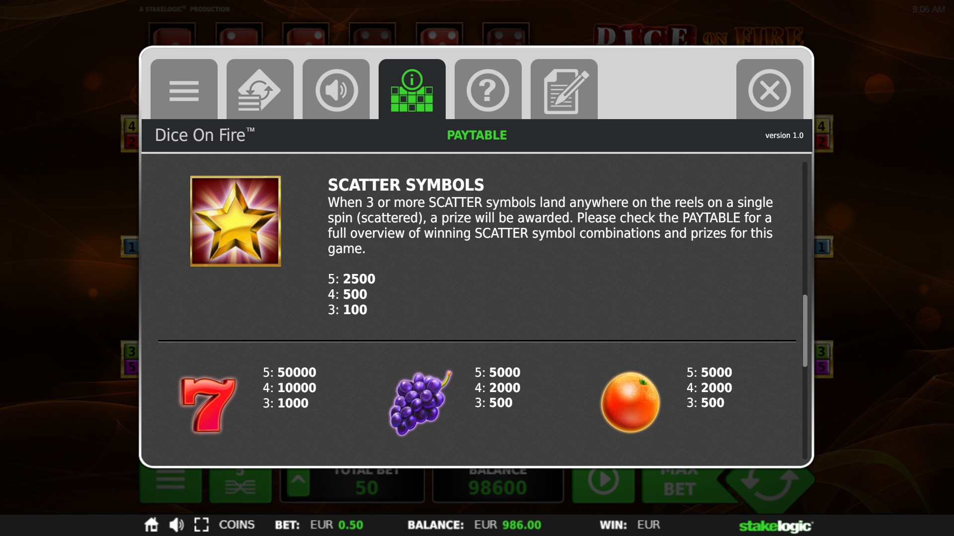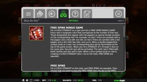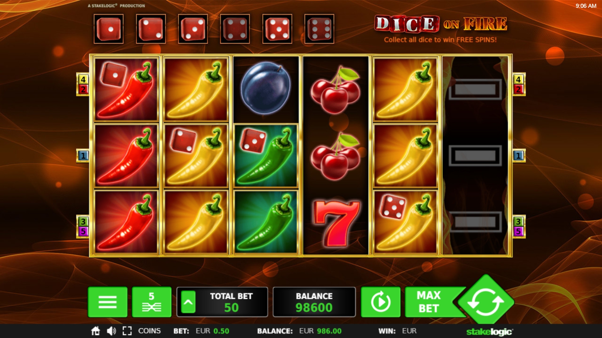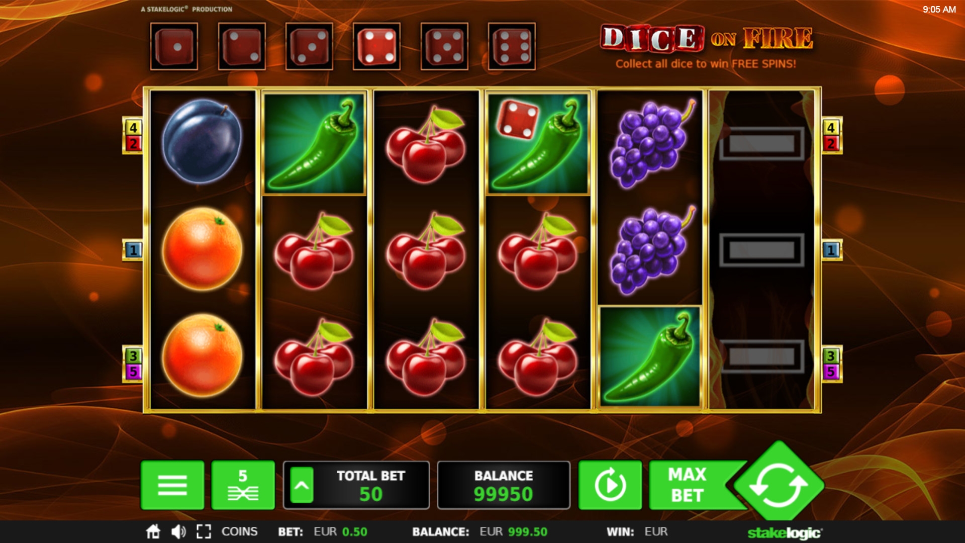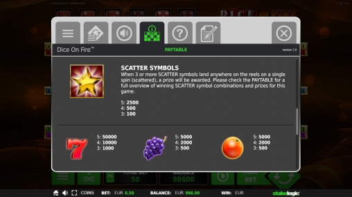 Видео-слот Dice on Fire обладает уникальной подборкой игровых функций. Базовые картинки могут быть помечены игральными кубиками с разным количеством точек. Также есть скаттеры, фри-спины с бонусами и другие опции.