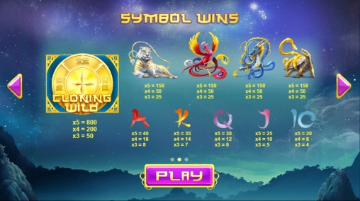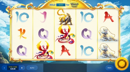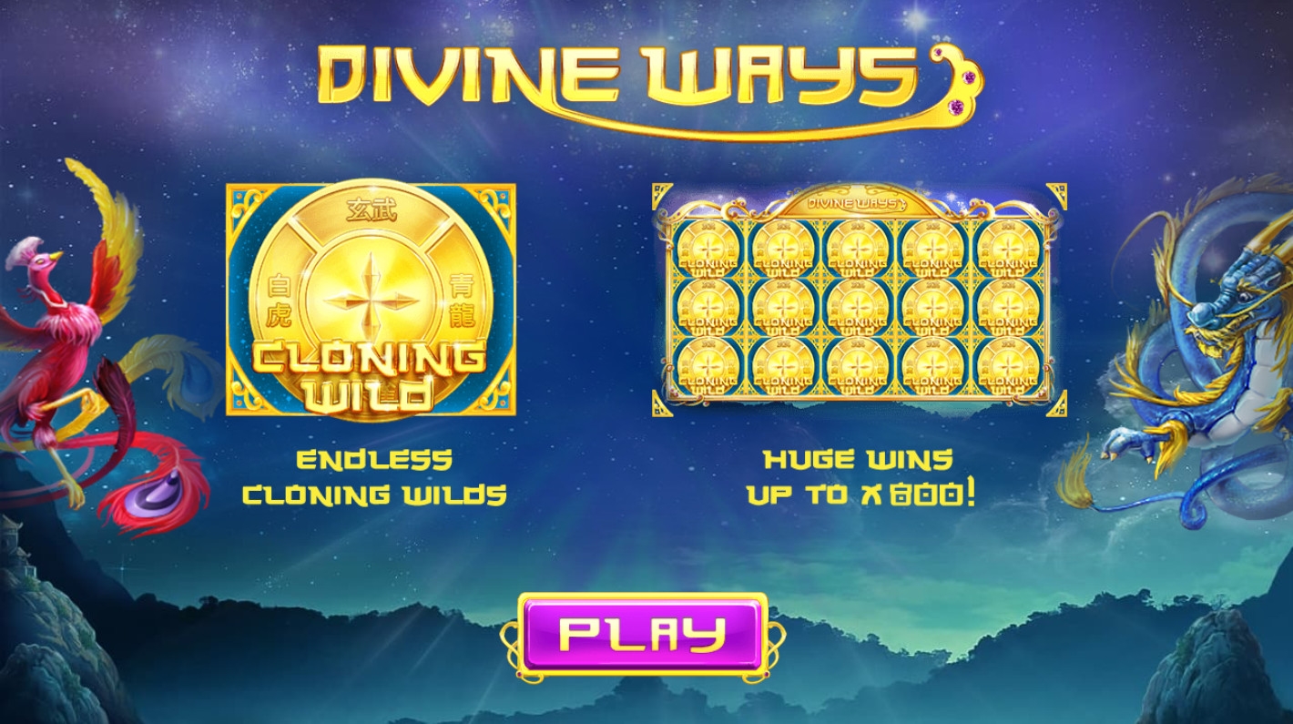 На экране Divine Ways появляются белый тигр с золотыми полосами, феникс, синий дракон, душащий черепаху змей, а также номиналы карт от десятки до туза.