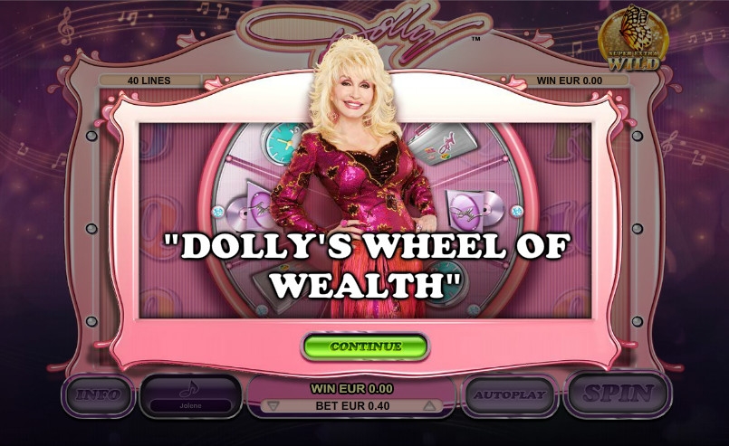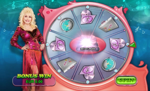 В призовой игре вы увидите на дополнительном экране Долли Партон рядом с барабаном, напоминающим колесо фортуны. В его секторах изображены три вида картинок: часы, чемодан и пластинки. Каждый из них запускает отдельный вид бонусного раунда.