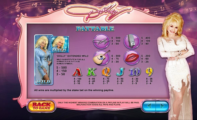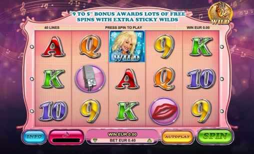 видео-слот посвящен Долли Партон, все картинки, изображенные на его барабане, имеют отношение к музыке в целом и творчеству «Королевы кантри» в частности. Вы увидите автограф певицы, микрофон, гитару, красные губы и разноцветные номиналы игральных карт от девятки до туза.