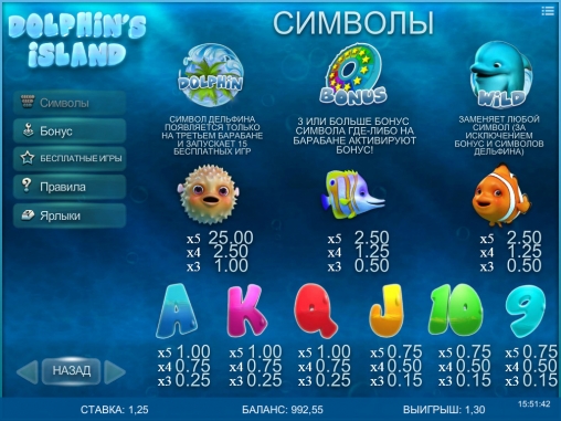 В качестве обычных картинок используются разноцветные морские рыбки и яркие номиналы игральных карт от девятки до туза. Особыми символами являются Dolphin (волна), Wild (дельфин) и Bonus (колесо фортуны). Об их возможностях читайте ниже:
