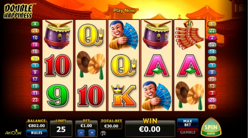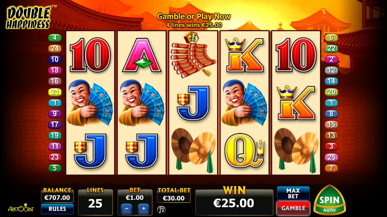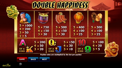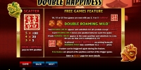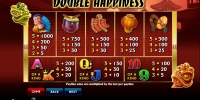 На экране автомата Double Happiness появляются красные китайские фонарики, фейерверки и другие предметы, которые ассоциируются с Китаем. Есть также китаец с веером и разноцветные буквы и цифры, означающие номиналы карт.