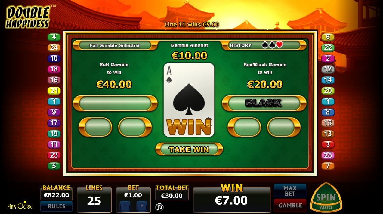 «Двойное счастье» - аппарат с пятью барабанами и тремя рядами символов на экране. Играть можно только по двадцати пяти активным линиям, сделав по ним равные ставки.