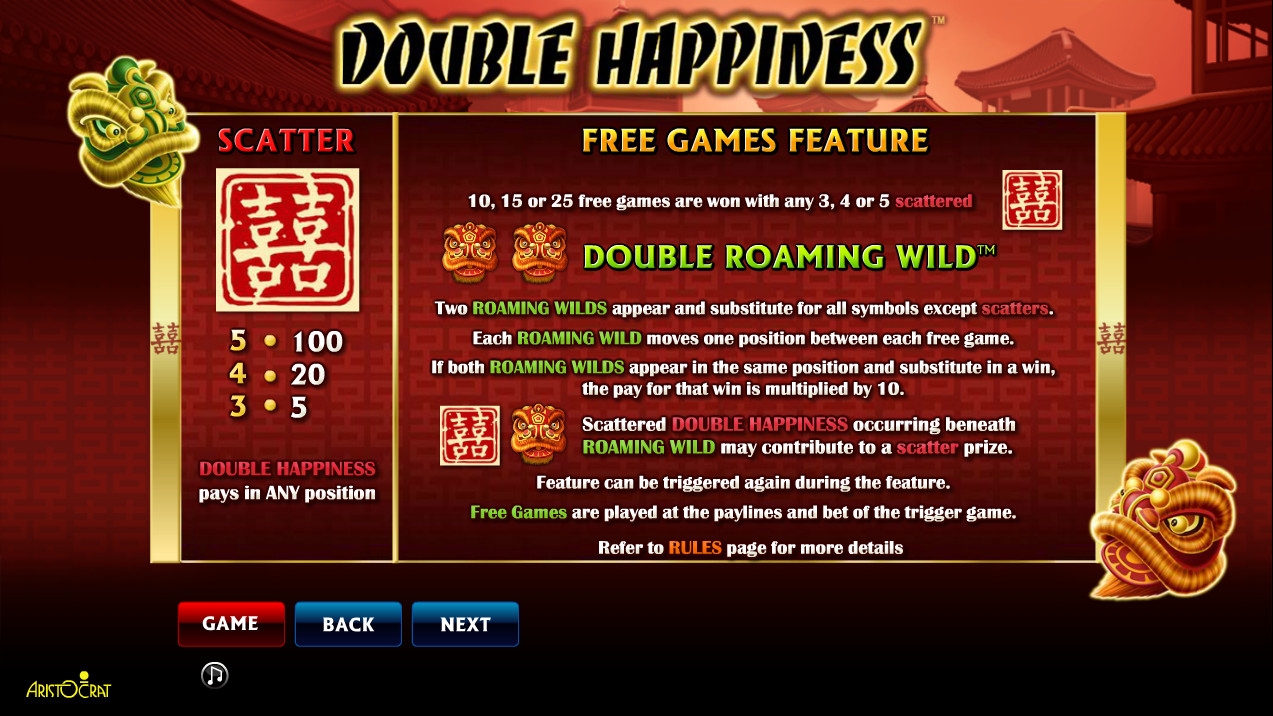 В данной статье от обозревателей энциклопедии азарта Casinoz пойдет речь об игровом автомате Double Happiness. Его разработали специалисты Aristocrat, а найти слот можно в различных казино на платформе NextGen Gaming. Модель посвящена очень популярной сейчас китайской тематике и радует широким выбором всевозможных опций геймплея, о которых рассказывается ниже.