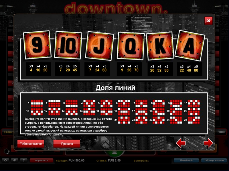 Downtown - это пяти-барабанный видео слот с 25-ю линиями выплат, производства 1x2 Gaming. В игре используется "wild"-символ, есть свободные вращения, мультипликатор и бонусная игра.