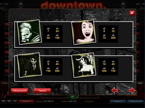 Бесплатный игровой автомат Downtown предлагает интересные символы к этой игре. Стиль нуар, не смотря на сложные сюжетные перипетии, в первую очередь, конечно же, повествует об отношениях между людьми. Поэтому не удивительно, что на всех основных символах изображены персонажи-люди. Вряд ли их можно назвать героями - они просто жители этого темного места и их романтизация Голливудом - это всего лишь дань философии декаданса. Человек в черных очках и в плаще целящийся из пистолета. Угрюмое лицо громилы, показывающееся из тени. Кричащая женщина и красотка в ковбойской шляпе и в платье с большим декольте. Инкогнито в блестящих очках - персонаж, дающий бесплатные вращения. Клетка, с кровавым пятном на полу - бонусный раунд. Наконец, самый яркий, похожий одновременно и на киноафишу и на огороженное желтыми лентами место преступления - "wild"-символ. Все символы на барабанах выполнены в стилистике рисунка тушью, похожей именно на произведения Фрэнка Миллера. На дополнительных символах изображены стандартные знаки карточной колоды от "девятки" до "туза". Символы имеют вид ржавых мишеней, на которых явно заметны пулевые отверстия, а сверху наложены соответствующие буквы или цифры.