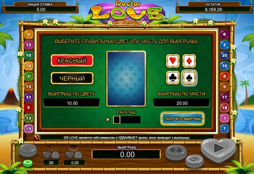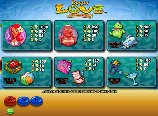 Сумма выплаты по комбинации в видео-слоте Dr Love on Vacation рассчитывается умножением ставки по линии на коэффициент (до х5000). Все выигрыши суммируются, после чего общую выплату можно перевести на счет или поставить на кон в игре по шансам.