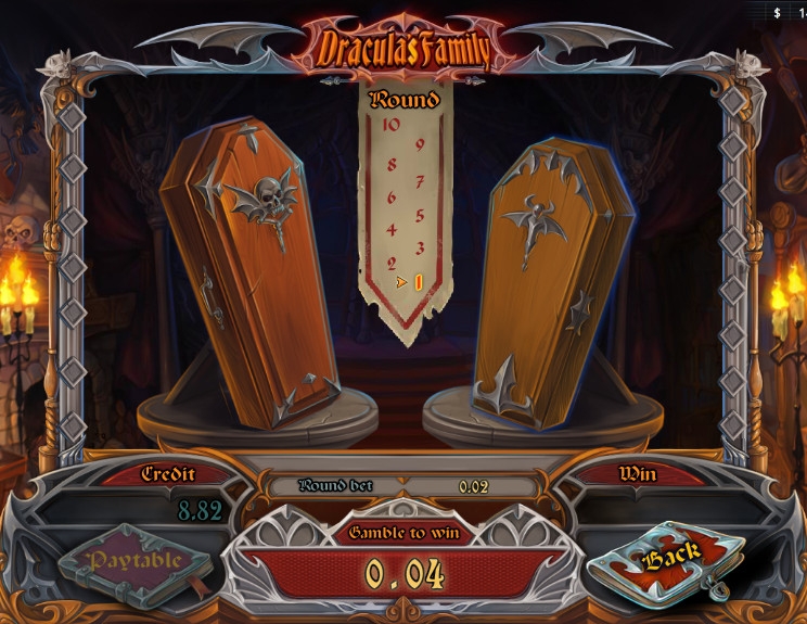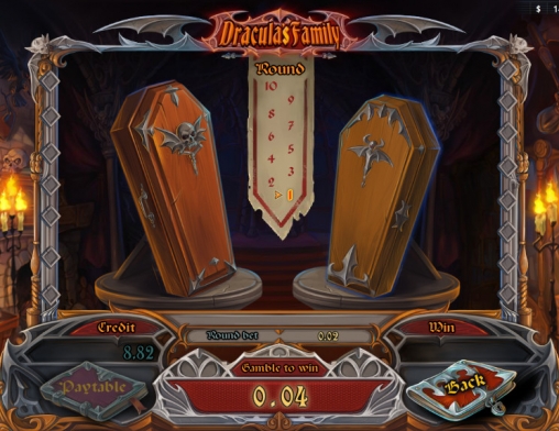 Общий выигрыш, начисленный за раунд, можно сразу не забирать, а поставить на кон в игре по шансам. Здесь нужно будет наугад открывать один из гробов. Если вам попадется золото, выплата удвоится. Если же из-под крышки вылетят летучие мыши, вы лишитесь сделанной ставки. В одном подходе можно играть до десяти раз подряд.