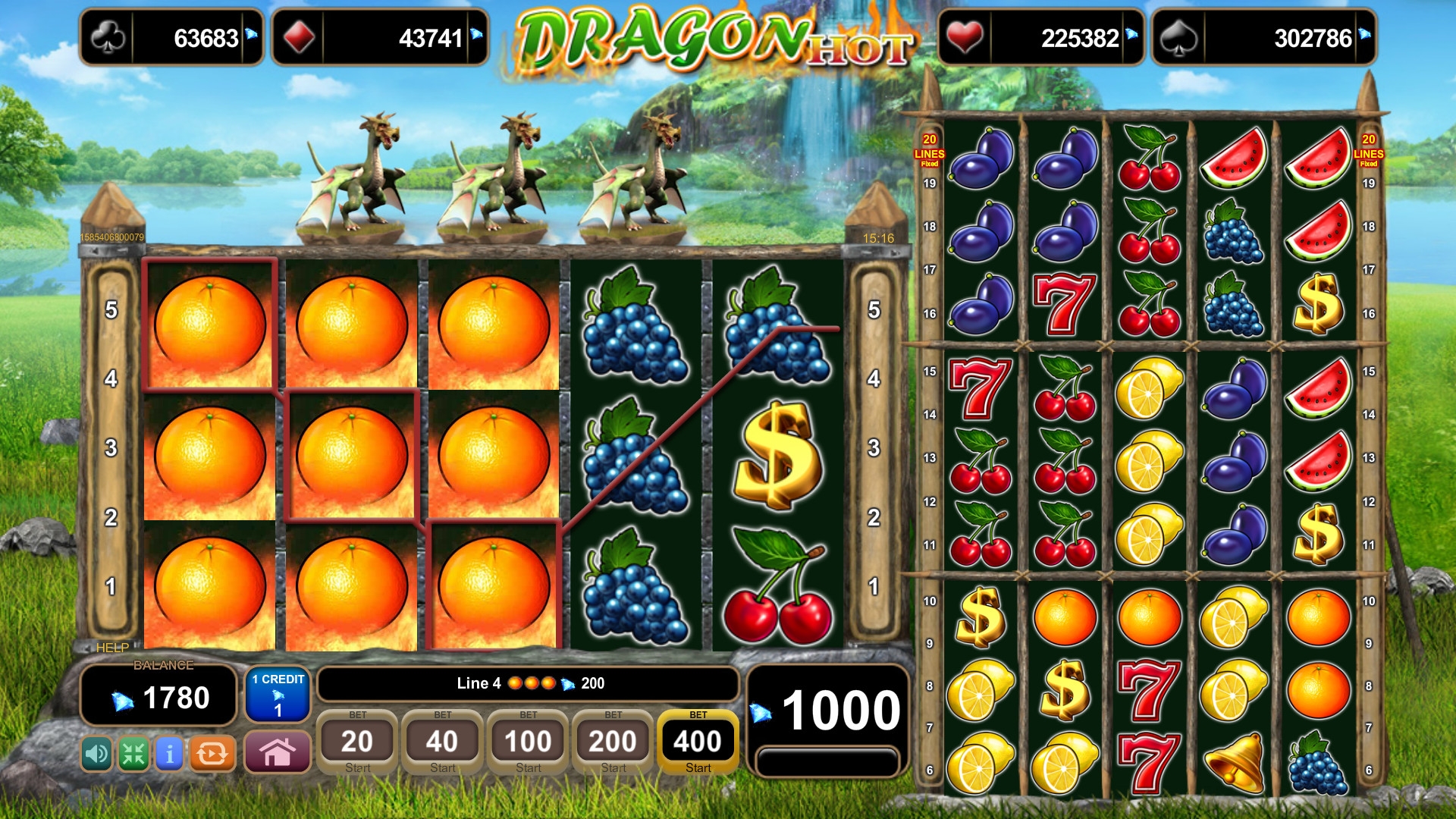 Dragon Hot – игровой аппарат с четырьмя экранами. На каждом из них вращаются по пять барабанов, а картинки выстраиваются по сетке 5х3.