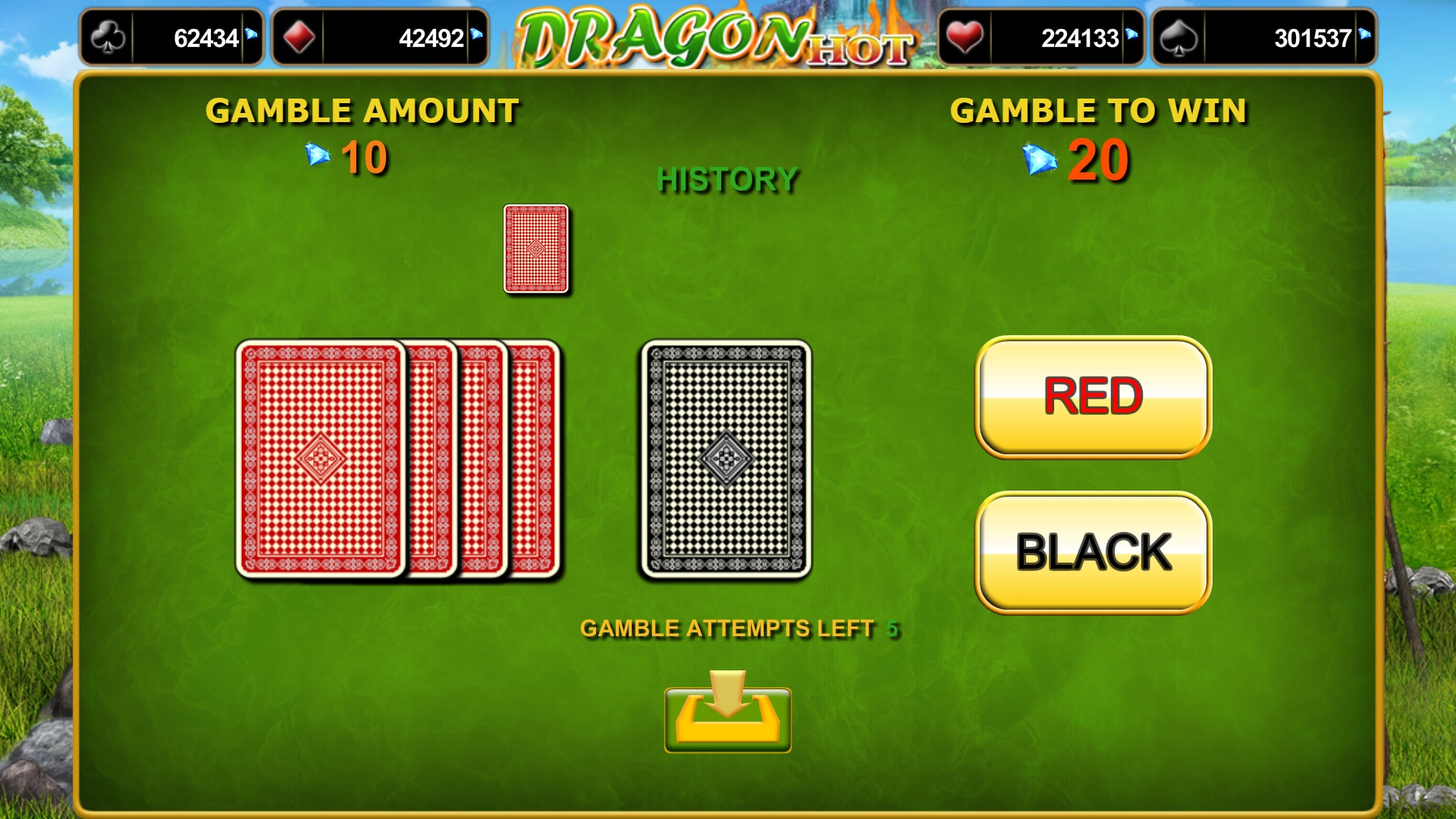 В Dragon Hot разыгрываются четыре накопительных джекпота EGT. Они названы по мастям игральных карт. В любом обычном спине может начаться розыгрыш на дополнительном экране. Необходимо выбирать наугад карты. Три одинаковых масти дают соответствующий джекпот.