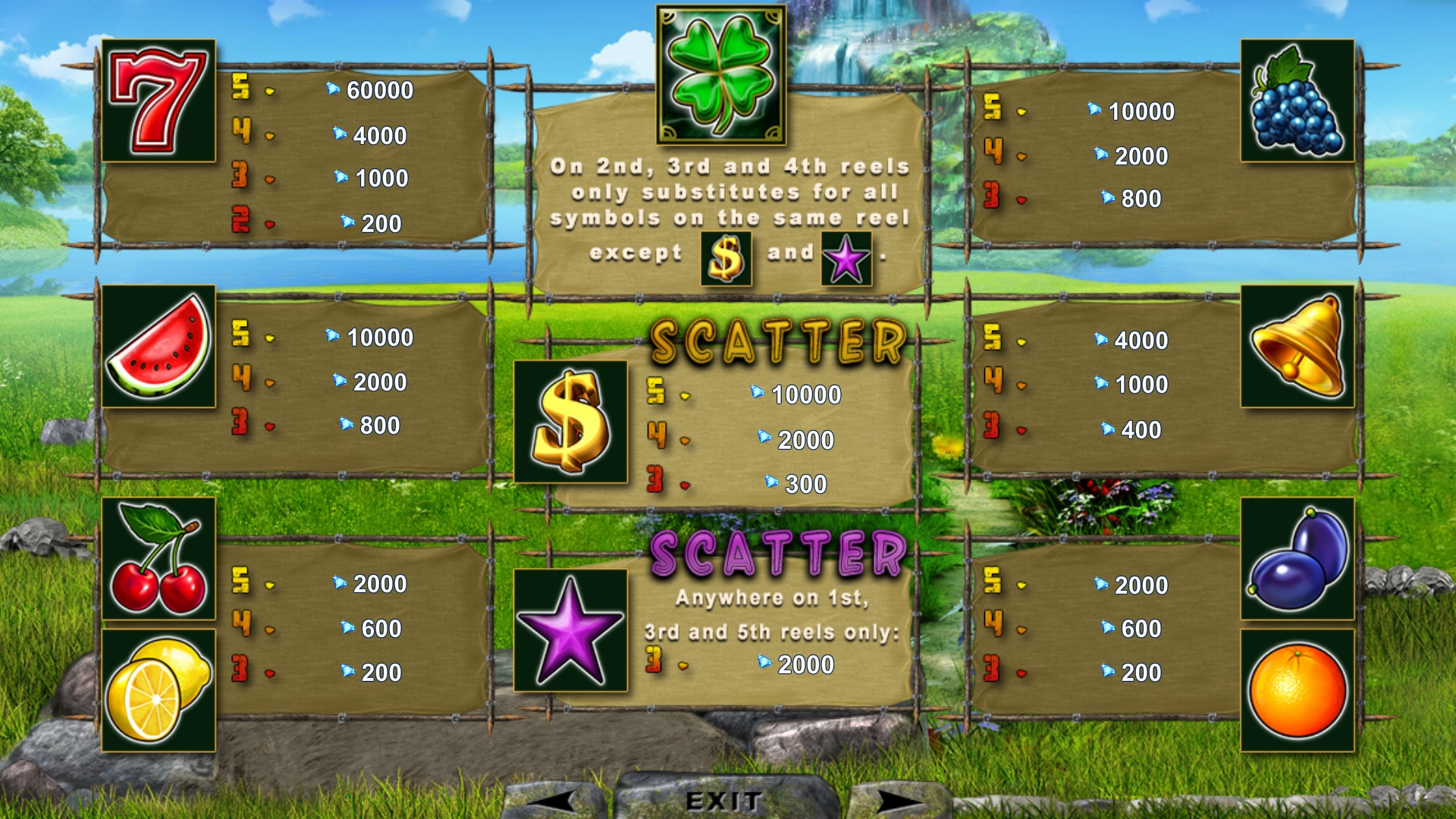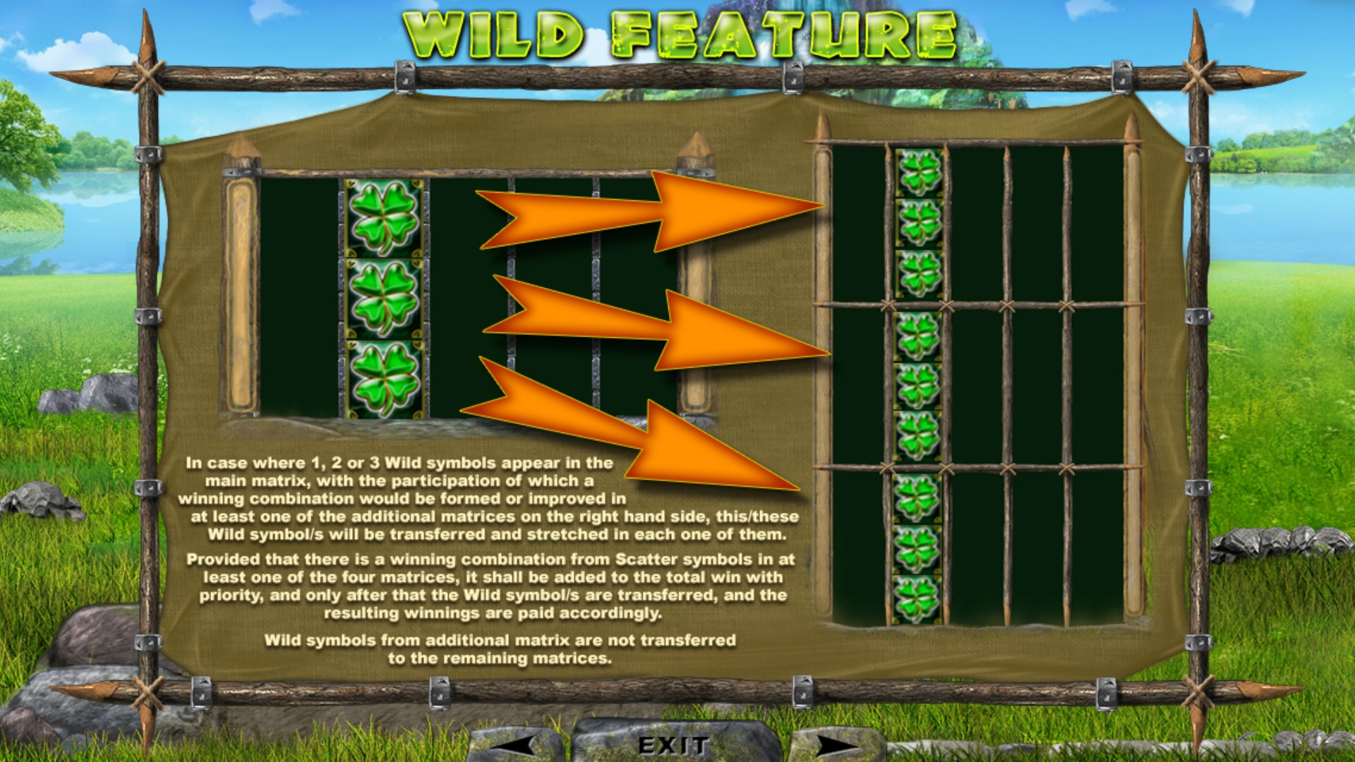- Wild (четырехлистный клевер) изображен на трех средних барабанах. Он не оплачивается, но помогает составлять цепочки из других элементов. Джокер не может заменять скаттеры.