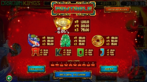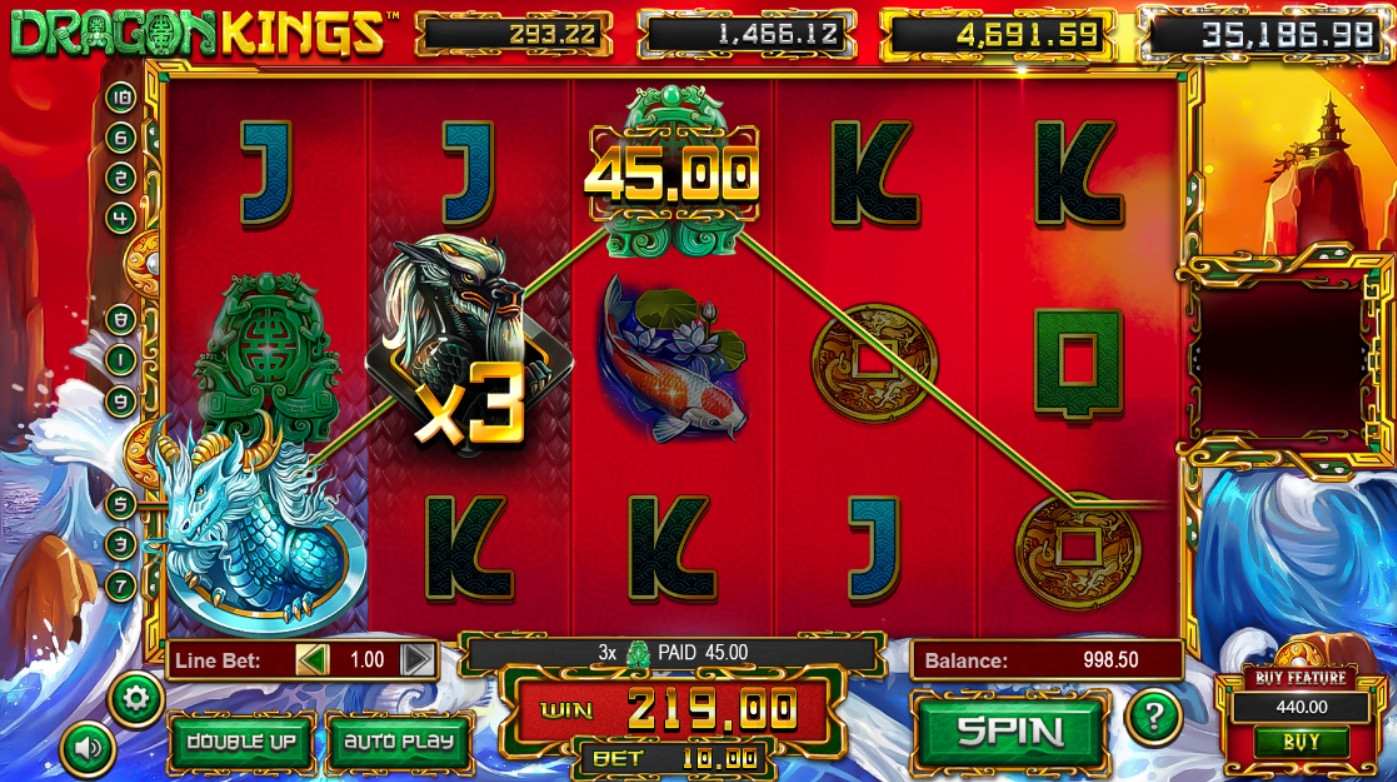 В игровом автомате «Царь-драконы» пять барабанов, десять фиксированных полос и пятнадцать картинок на основном экране.