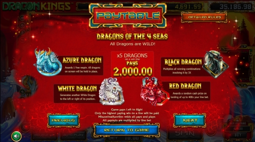 При расчете выплат ставка по линии умножается на коэффициенты сложившихся последовательностей. Они бывают от х4 до х1000. В определенных ситуациях, описанных ниже в обзоре Dragon Kings, задействуются дополнительные множители.