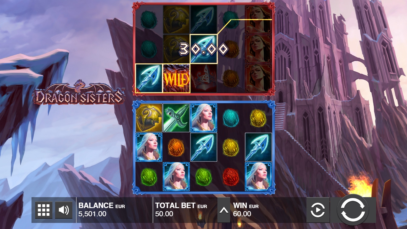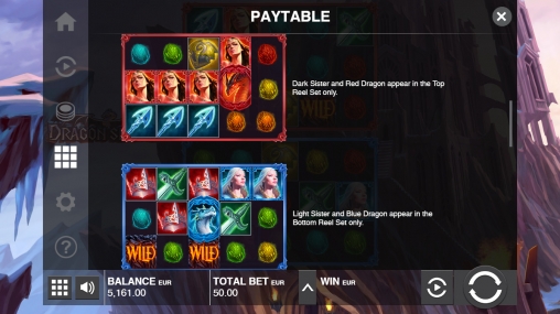 Видео-слот Dragon Sisters состоит из двух отдельных экранов, расположенных друг над другом. На них вращаются по пять барабанов. Когда они неподвижны, в колонках видны по пять картинок.