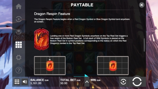 - Blue Dragon Respins – Синий дракон на нижнем экране начинает респин в верхнем окне. Он также заполняет три случайно выбранных ячейки джокерами.