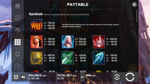 На барабанах видео-слота нарисованы разноцветные яйца дракона, копье, меч, щит, корона и две девушки. Брюнетка появляется на верхнем экране, а блондинка – на нижнем. Картинки выпадают в колонках длинными полосами.