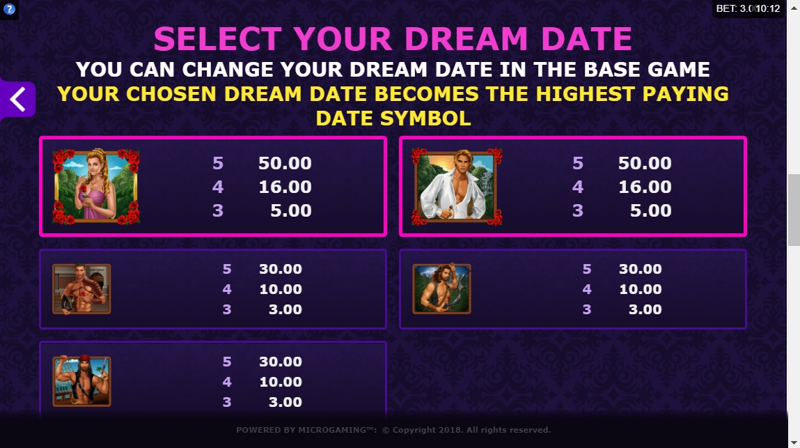 Игровой аппарат Dream Date компании Microgaming выдержан в духе времени. Он позволяет смоделировать идеальное свидание, выбрав эпоху и партнера. Вы можете оказаться в Средневековье или в наши дни, а также решаете, кто должен отправиться на романтическую встречу с прекрасной дамой.