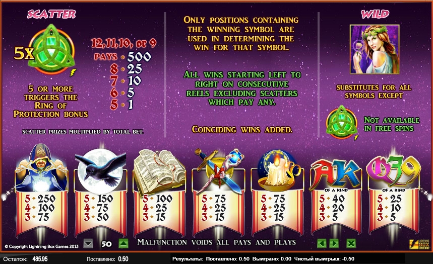 Призовой раунд Ring of Protection представляет собой двенадцать бесплатных спинов, во время которых действует ставка из предыдущего раунда, но делает ее казино. Во время вращений на экране блокируются все Free Spin Wild, которые появляются в любой позиции. Они также дают право на дополнительные спины. Если заблокируются двенадцать Wild, вы получите право на один мегаспин. Завершает раунд символ Poison (яд). Подробности правил вы сможете уточнить в таблице выплат.
