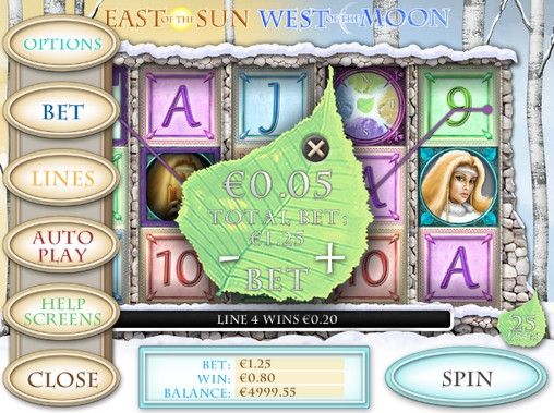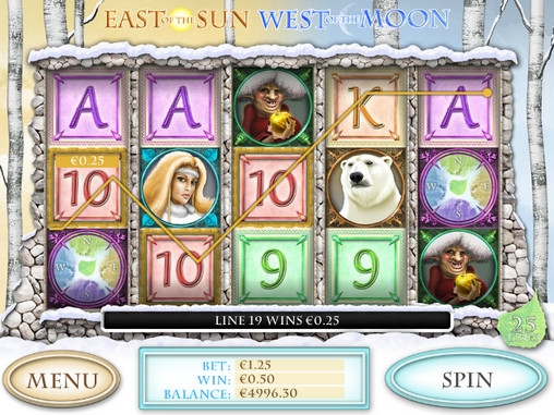 East of the Sun, West of the Moon – видео-слот с пятью барабанами, тремя рядами символов на экране и двадцатью пятью линиями, количество которых можно активировать по собственному усмотрению. На каждую из них принимается от одного цента до десяти евро. Так что играть на игровом автомате можно по максимальной ставке двести пятьдесят евро.