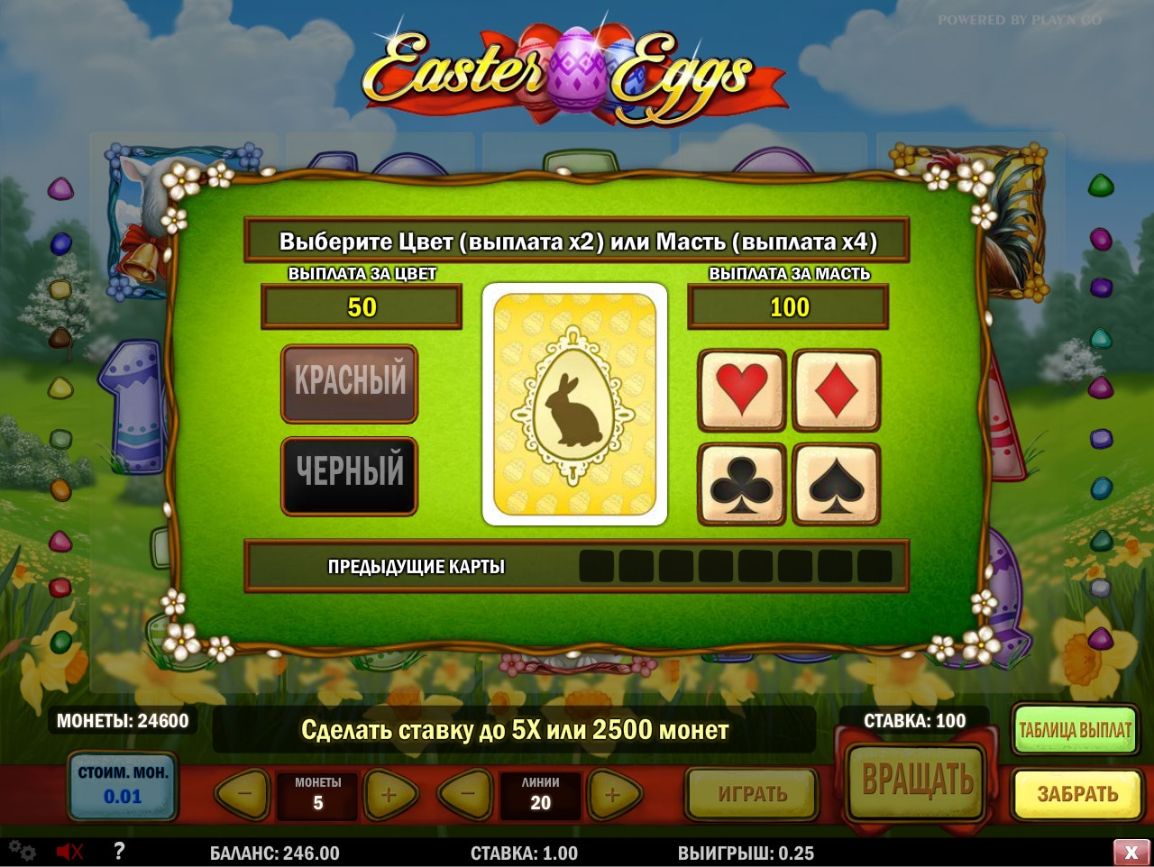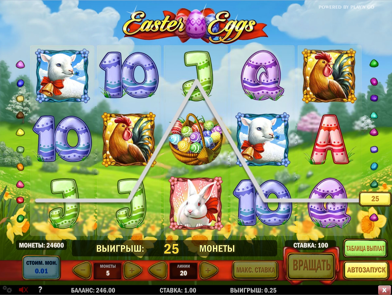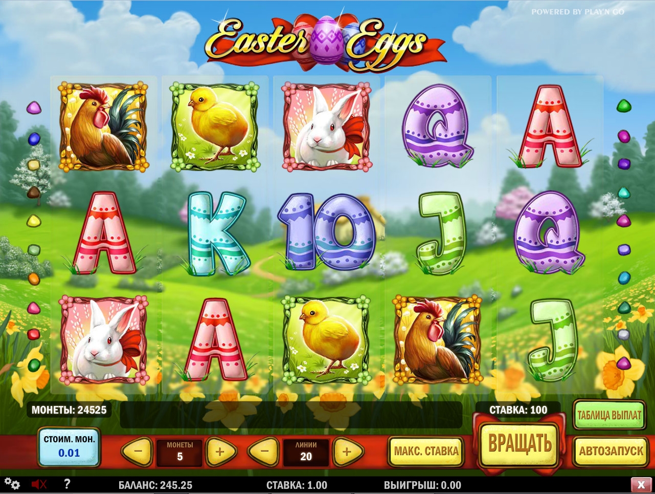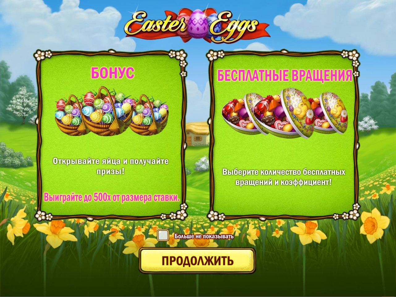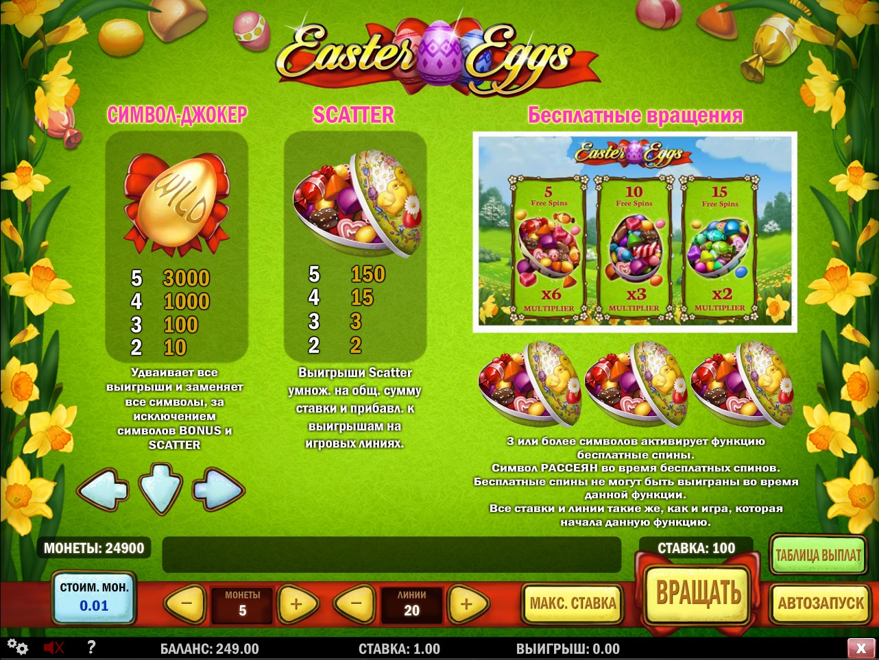 В призовой игре нужно просто выбирать наугад пасхальные яйца. Выиграть можно до пятисот общих ставок на спин.