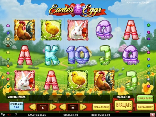 Easter Eggs – слот с пятью барабанами, двадцатью линиями и широким выбором функций, включая обычные символы, особые элементы, призовые вращения, игру по шансам, дополнительные множители и прочие опции.